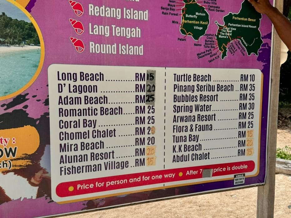 Il trasporto è stato senza dubbio la spesa più rilevante del nostro soggiorno alle Perhentian: considera un prezzo medio di €3 per tratta e moltiplicalo per almeno 4 o 5 tappe che farai durante la giornata (andata e ritorno dal tuo alloggio più un paio di spiagge): spenderai almeno 15€ giornalieri e considerando che dopo le 19:00 il prezzo raddoppia, calcola all’ incirca €20 a persona al giorno, solo per i trasporti.